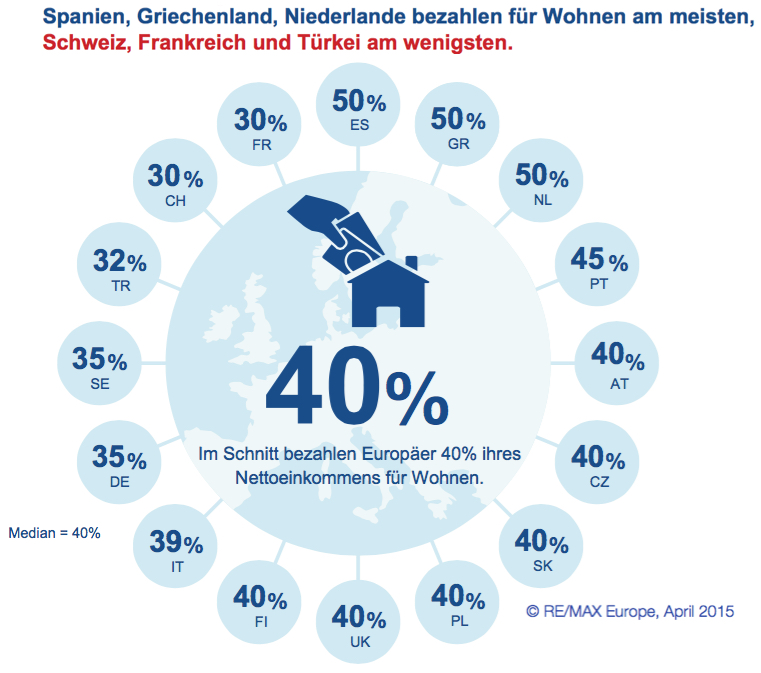 Die meisten Eigenheimbesitzer gibt es in Großbritannien, den Niederlanden und Italien – Schweizer, Deutsche und Österreicher bevorzugen hingegen eine Mietwohnung. Im Durchschnitt geben Europäer 40 Prozent ihres Haushaltseinkommens für Wohnen aus.
