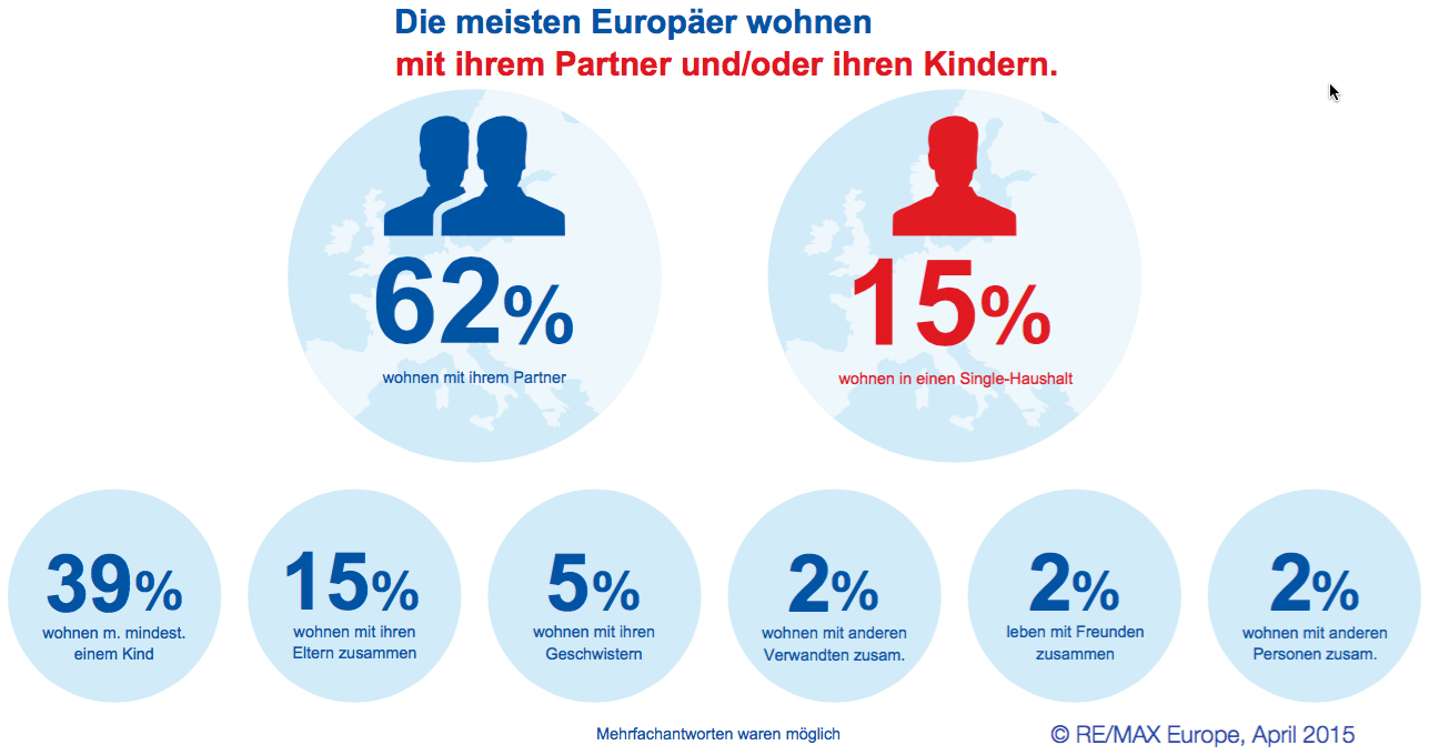 Europäer geben im Durchschnitt rund 40 Prozent ihres Haushaltseinkommens für Wohnen aus und glauben dass dieser Anteil aufgrund steigender Preise weiter zunehmen wird. Sechs von zehn Europäern leben gemeinsam mit ihrem Partner, 39 Prozent mit einem oder mehreren Kindern, so eine aktuelle Studie von RE/MAX Europe, dem größten Immobilien-Franchise Netzwerk Europas.